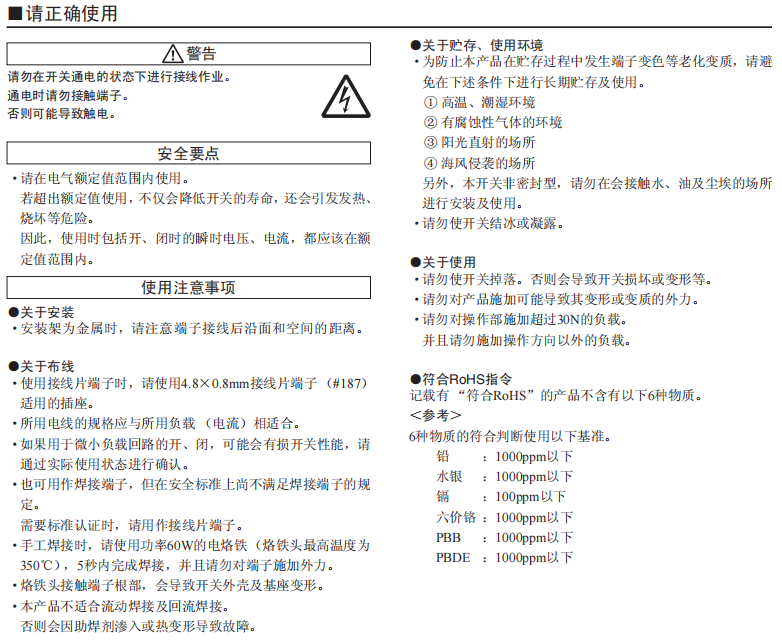 接點間隔3mm以上的小型電源開關 采用特定的速斷機構,可進行功率負載開、閉。開、閉利落、良好的操作感。 確保接點間隔3mm以上。 符合UL、cUL標準、符合EN標準。