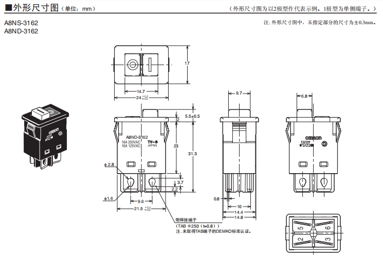 A8M 小型船型開關(guān) 實(shí)現(xiàn)16A開關(guān)性能的小型船形開關(guān) 小型、16A的開關(guān)性能。 可進(jìn)行一觸式安裝。 符合UL、cUL認(rèn)證,EN標(biāo)準(zhǔn)適用品。