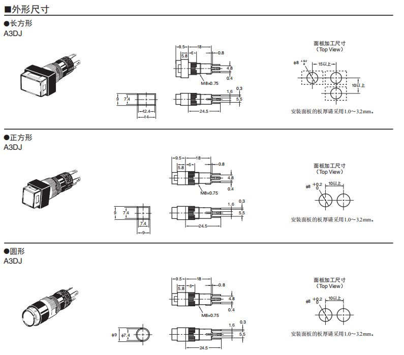 軀干長(zhǎng)18mm、 圓軀干型f8系列 ●高亮度的均一表面發(fā)光。 ●圓形便于開(kāi)孔。 ●形狀小巧,操作感好。